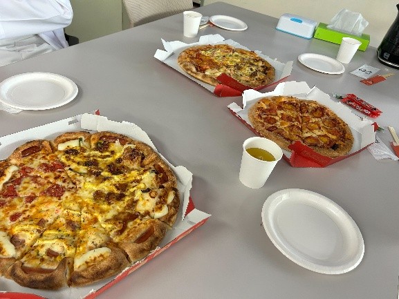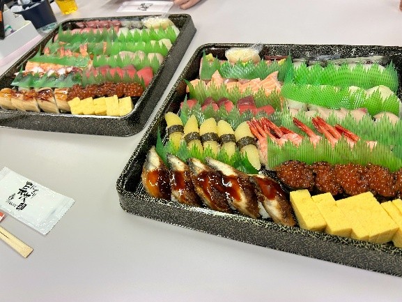 リサーチクラークシップ(研究室配属)で研究していた2名の医学生が、無事に3月の研究報告会を終えました。皆が集まれるようランチタイムに頑張ったお二人の送別会を開催しました。お寿司やピザを囲みながら、初期研修医の先生や専攻医の先生も交え、多くの先生方と和やかなひと時を過ごしました。